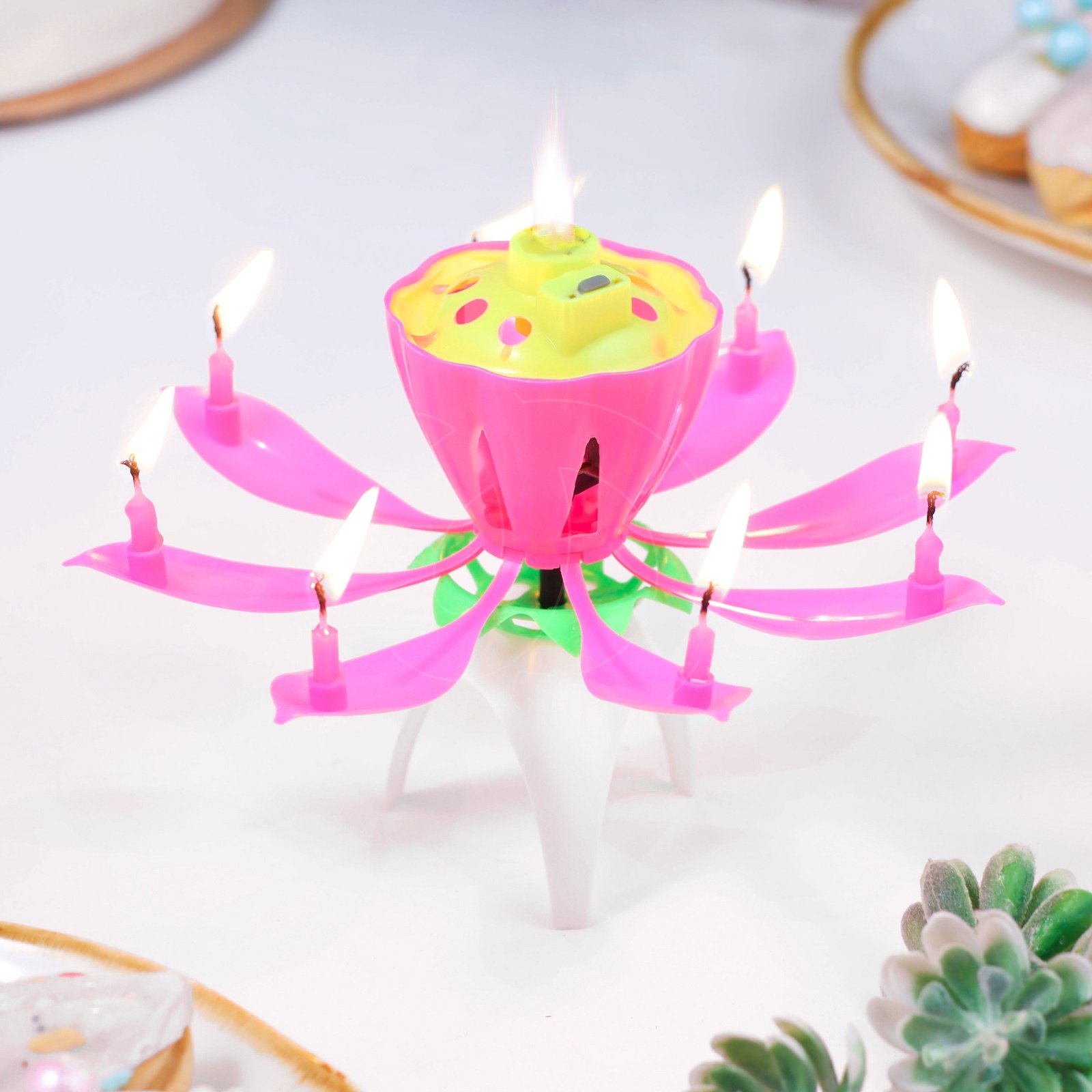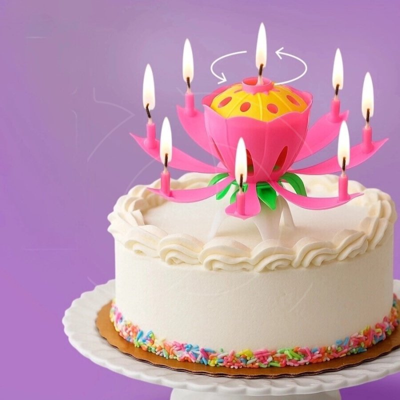 Установите свечку в торт и подожгите фитиль. Сначала вы увидите фонтан искр, который абсолютно безопасен, а через несколько секунд под музыку распустится цветок с огоньками.